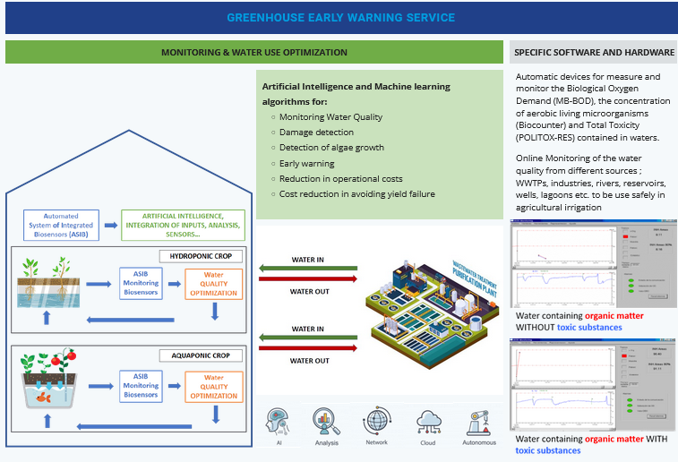 Automated device for “online” monitoring of the concentration of total microorganisms in water samples in 15 minutes. It is essential to monitor drinking, bathing and irrigation water because waterborne pathogens constitute one of the main risks to our health. Also, within the agri-food industry (i.e. washing vegetables water) this parameter becomes critical.