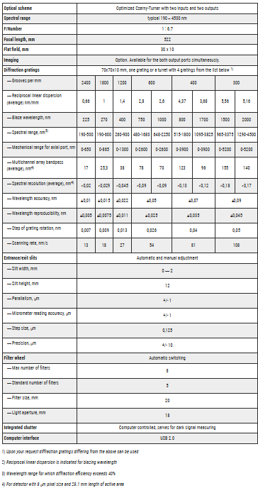 • Two input and two output ports can be completed with the full set of accessories manufactured by SOLAR LS: standard and crossed entrance slits, order separating filter wheels, aperture matching units and optical fibers, CCD detectors and adapters for them.