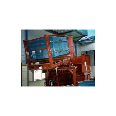 The transfer robot is a device that automatically transports sorted goods from the second sorting to a pit press for large bales or a weighing station for further division into small bales. It consists of a frame that moves over a rail along a line of sorting boxes with a capacity of ± 500 kg of clothing. When a box is full, the control system of the robot activates and sends the robot to the specific box. The content of the box is emptied inside the robot. Next, the robot drives to the press or weighing station and automatically empties the content.