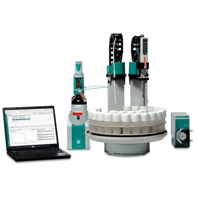 Fully automated system for volumetric Karl Fischer water content determination in up to 53 samples. This system is controlled with OMNIS software and consists of an 815 Robotic USB Sample Processor XL, a 901 Titrando, a Polytron PT 1300 D and extensive accessories. The samples are weighed out into beakers, sealed to protect against humidity and placed on the rack. Before the actual titration, a defined volume of KF reagent is added and the sample is pulverized with the help of a Polytron. The water that is released is titrated afterwards. Even samples of poor solubility, e.g., tablets, can be analyzed without difficulty with this method. The use of solubility promoters can be avoided in this way.