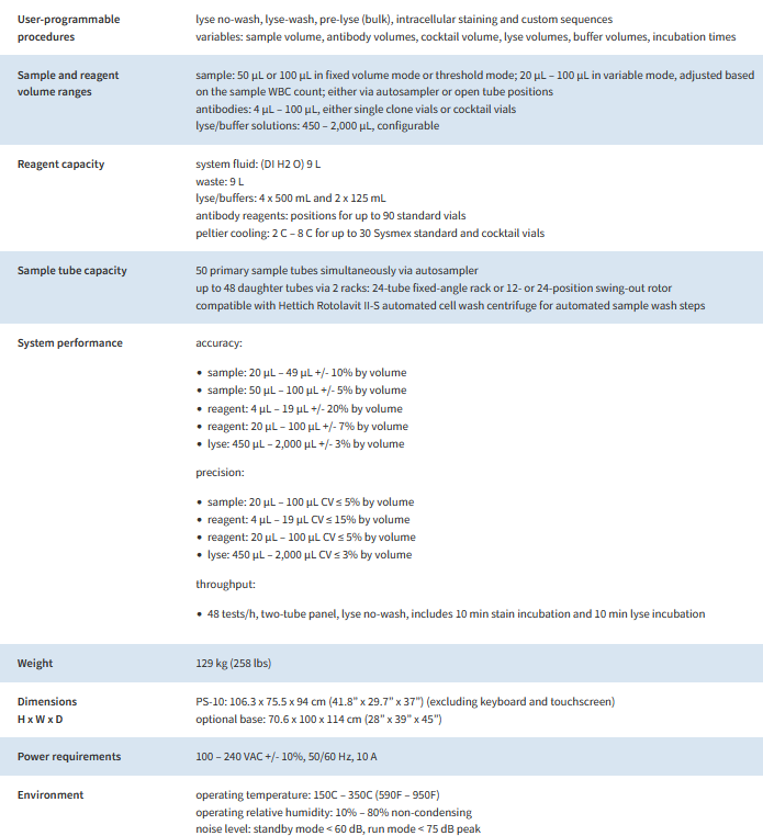 Many labs follow the guidelines or use Laboratory-Developed Tests. Washing cells and adding antibodies are routine steps in these processes. As different as the protocols and panels might be, you can easily program them in the PS-10 software.