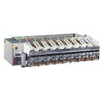Equipment is very easy to set for a desired batch volume (weight). It distributes the product using vibration plates so it moves into the channels and weighing buckets evenly. It continuously checks the weight in each of the buckets and its program computes the optimal combination, so each dose released form the buckets is as close over the set weight as possible. thecontents of the buckets is usually released on a gathering cross conveyor and moved into the chute of packing machine.