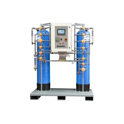 DA/V Automatic deionizers ion exchange separated bed system (cation-anion), complete with fiberglass vessels, control panel with PLC, conductivity control, pneumatic control valves, interconnection pipes made in PVC; the system is completely interconnected and skid-mounted.