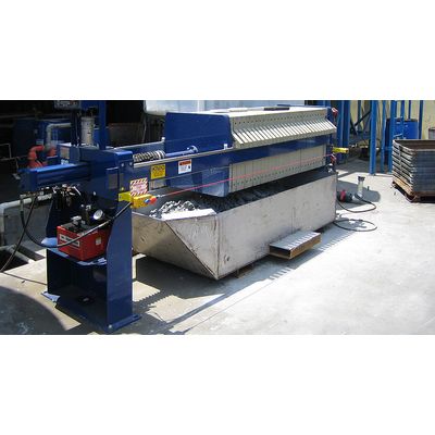 This 630 mm automatic filter press is available in sizes from 1 cu. ft. up to 10 cu. ft. in volume. Automatic closure allows operation to be accomplished with the simple turn of a switch. In addition, the hydraulic cylinder and follower are coupled together.
