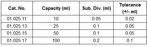 Burettes RELIGLAS, Automatic Zero, with Glass Key Stopcock, mounted on Reservoir, Rubber bellow, Accuracy as per Class A of IS 1997 : 2008, with calibration certificate. Reservoir Capacity for 10ml burettes is 500ml and for 25, 50 & 100ml burettes is 2000ml.