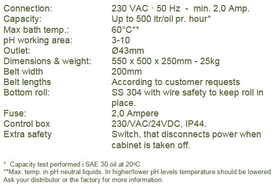Our tests have shown that this intelligent oil skimmer can work up to 87% more efficient than normal oil skimming. The compact design makes the skimmer easy to install. The machine is built in stainless steel and is constructed to require a minimum of maintenance.