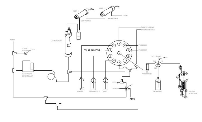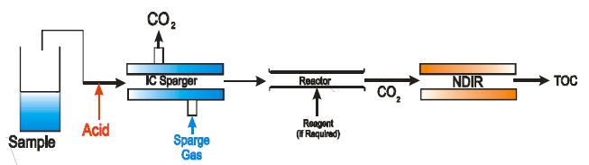 Sample is mixed with acid, lowering the pH to 2.0. This converts the inorganic carbon to dissolved CO2, which is Air/O2 stripped out of the solution. Reagent is added if required and the remaining organic carbon is then oxidized in the Reactor to form CO2, which is detected by the NDIR as an interference-free direct correlation to TOC.