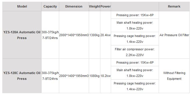 From above information, it is obvious that the main difference between the two model is that YZS-128A  automatic press adds an air pressure filter to directly filter the pressed oil, while, YZS-128C doesn’t come with the filtering device since many customer will equip their oil mill with single filter, such oil filter press or vertical pressure filter press. The two model automatic oil presses are the most advanced screw oil press in today’s oil making market because its designs can save oil extracting cost, operating labors, protect environment and maximize the oil yields. (Lear more information about other oil processing machine>>)