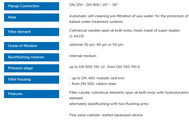 Due to automatic backflushing, perfect regeneration of the filter mesh is ensured. The filter, operating fully automatic, conforms to the regulations of unsupervised operation on ships. A continuous series with different sizes of housing and nominal connection widths, permit adapted dimensioning of the ballast water filter to individual circumstances.