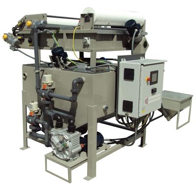 ClearFlow CF-200 200 Gallon Batch Treatment capacities up to 400 GPH, in a fully automated process. Stainless Steel construction, powder and clear ceramic coating. Automation includes HMI Touchscreen. VFD on all motors, process monitoring to ensure proper treatment. 250 pound ClearFloc hopper with flexible auger dosing. Optional Sludge Press available that will remove more water from the flocc solids by providing a progressive pressure force as the solids are advancing on the belt.