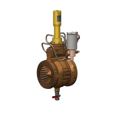 This valve is electrically actuated and provides pressure control. This valve is used where a constant downstream pressure and a controlled smooth opening and closing of the deluge water supply is called for. The valve`s adjustable restrictors can be set to provide the opening- and closing speed desired, to prevent the damaging effects of reaction forces and water hammer. The valve is fitted with an external heavy duty solenoid valve to facilitate reliable electrical activation. The solenoid is fitted with a latch that locks the deluge valve open when activated, thus requireing manual re-setting to close.
