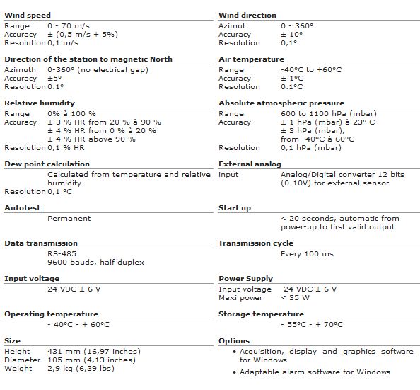 The sensor WST7000C is a high quality instrument. All its components are integrated in a weatherproof cylinder. The microprocessor determines meteorological parameters, performs the auto test, sends the signal of measures and of their validity. This sensor is an intelligent device, it is capable of communicating over a multipoint network via its serial digital RS-485 output.