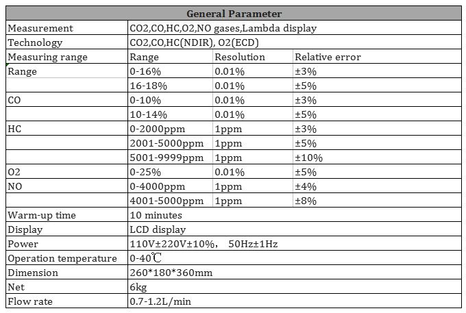 • Simultaneous measuring CO, CO2, NO, HC, O2, Lambda.