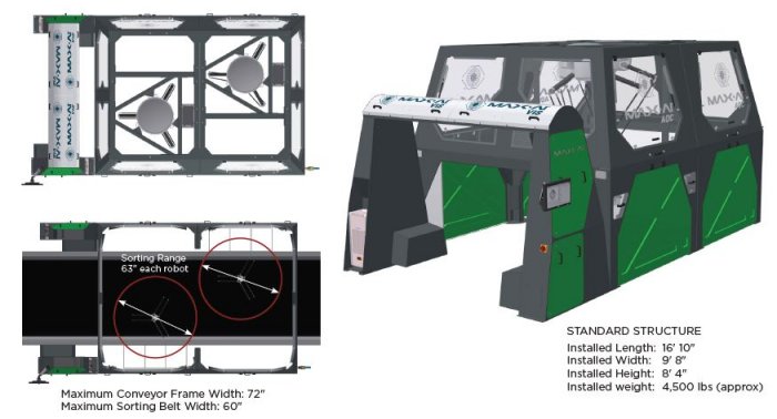 Max-AI AQCs (Autonomous Quality Control) are the ultimate in post-sort automation. When combined with NRT optical sorters, the paper and container sorting process is 100% autonomous and the need for human contact with waste is eliminated. The AQC-2 makes multiple sorting decisions autonomously; for example, separating plastic film, small cardboard, containers and residue from a stream of newspaper. All of this is done at rates exceeding human capabilities and each pick is prioritized for profitability. This advanced technology uses a machine vision system to see the material, specialized artificial intelligence to think and identify each item, and robotic sorters to pick targeted items or contamination. Max-AI AQCs provide MRF operators with sustained and consistent sorting performance while improving safety, recovery, product quality and operational expenses.