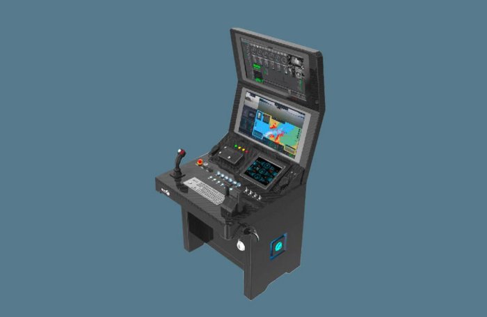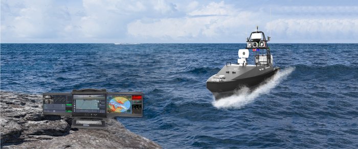 The multi-screen control base station can be deployed in a shore-based command center, on a mothership, or in a moving vehicle, depending on the scenario.