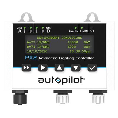 The Autopilot PX2 Advanced Lighting Controller provides precision photoperiod control of up to 512 fixtures in two independently controlled zones, all from one centralized location. Designed to work with any controllable Phantom or Core HID fixtures, as well as PHOTOBIO LED fixtures, the PX2 can control 512 digital HID fixtures (256 per zone), or 100 analog LED fixtures (50 per zone). The PX2 offers the flexibility to operate both zones analog or digital, or one zone analog and the other digital.