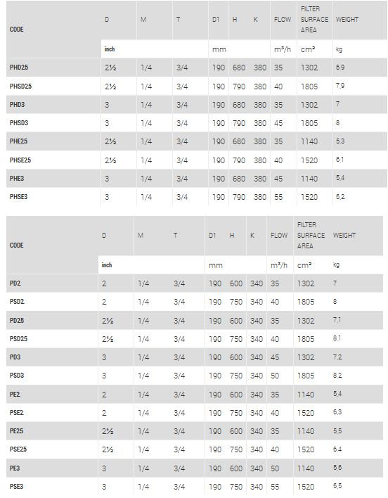 Body material pa %30 gfr. Cartridge material pp (disc) pa (screen aisi 304 cage pa ). Maximum working pressure 8 bar (116 psi). Maximum working temperature 60 ⁰ c (140 f). The filtration degree 20-50-100-125 micron. Cartridge of filters d: disc cartridge, e: screen cartridge