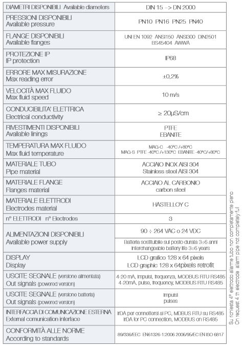The electro-magnetic flow meter model MAG-C has been engineered so to measure the flow and the volume of any liquid that is electrically conductor. Those flow meters do not have any mechanical moving component, and therefore the liquid do not have any obstacle in its flowing, thus avoiding any damage caused by solids that can be in the liquid. The internal part of the measuring pipe is electrically insulated and therefore the liquid to be measured does not have any possibility to be in contact with the material by which the pipe and the flanges are made. That allows the possibility of measuring any type of liquid compatible with the internal cladding. The MAG-C meters enjoys a very low head of loss and the possibility of mounting in every position, and therefore are suitable for every sector of the chemical, paper, food industries and water works.