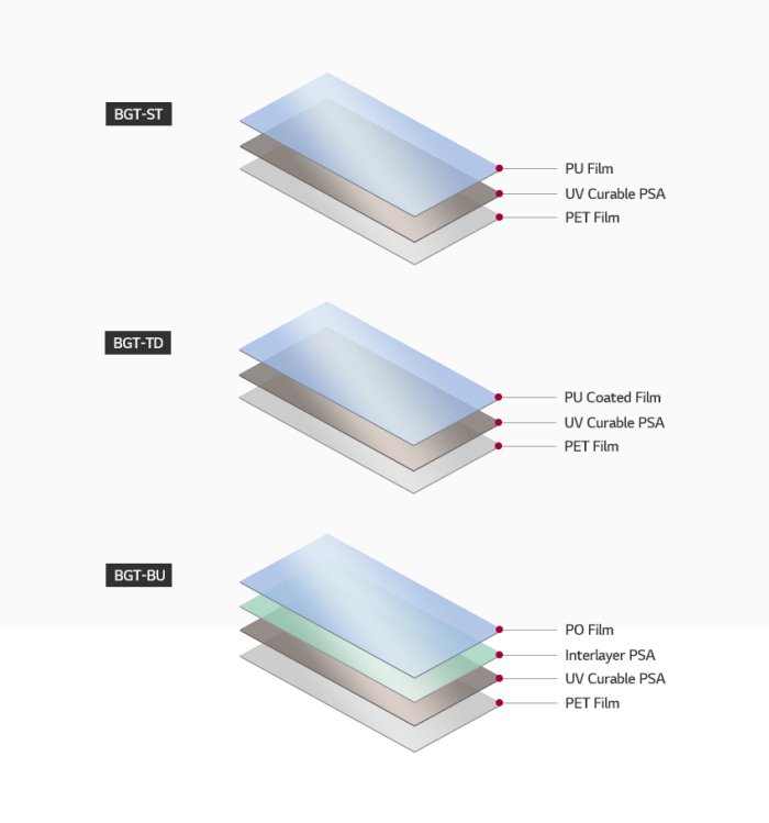 Material which protects the wafer surface during back grinding. BGT(Backside Grinding Tape) is used to protect the wafer surface during back grinding after the IC is formed on the wafer. Attached on the circuit surface, it prevents damages to the circuit surface and pollutions to the wafer surface and improves the grinding accuracy of the wafer. Especially, it can perfectly protect the wafer pattern surface and the chip during the manufacturing process with its excellent physical and chemical properties.
