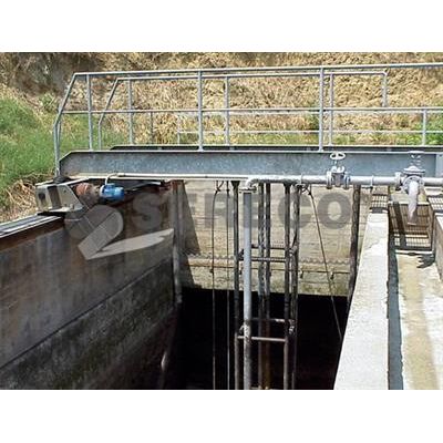 The PRVA type is a valid alternative to the PRVR type with scraper and is particularly recommended for the water with considerable loads of sludge and floating materials. The bridge consists of a mobile girder used as a walkway, a couple of lateral sliding trolleys, a sludge removal system a surface scraper system for the scum removal, a gear motor for the lateral trolley driving, a control unit for the articulated bottom scraper-skimming blade system and a control panel. The gear motor and the control unit are fitted on in correspondence of the bridge centerline. The water goes in from one of the short side of the tank.