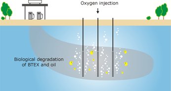 Bacterial removal of mineral oil and aromatic compounds. When an area is contaminated with mineral oil or aromatic compounds, like for instance benzene, toluene, ethylbenzene, xylene and naphthalene (BTEXN), these pollutants can be removed via a biological approach we call biosparging. We make clever use of nature’s resourcefulness by putting aerobic bacteria that can break down mineral oils and BTEXN to work. However, the deeper layers of the soil and groundwater are mostly anaerobic. To accommodate the bacteria of oxygen we therefore inject this into the soil and groundwater with injection filters. This direct supply of oxygen to the bacteria enhances their degradation capacity of the minerals oils and BTEXN.