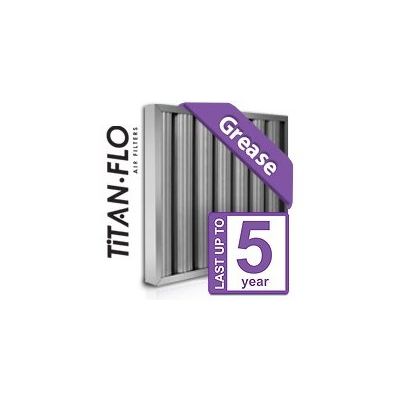 The washable Air Filters, Inc. Titan-Flo grease filter is specifically engineered for kitchen ventilating systems and is designed to be installed in standard canopies or backshelf assemblies. A series of offset baffles positioned vertically within a frame alters the flow of grease-laden air. The Grease impinges upon the baffles and drains downward. Holes in the frame bottom divert the grease into a trough and to a container away from the fire danger area.