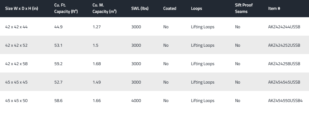 Bulk Bag Depot’s Baffled bulk bags are offered in a variety of sizes and configurations. Specifications for our in-stock bulk bags are outlined below.