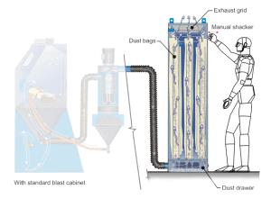 DC50 dust collector is a good solution for tight budgets that don’t allow purchase of higher end, more efficient models of shaker dust collectors. Suitable for occasional-to-regular users of semi-industrial sandblasting cabinets, such as Econoblast and ECAB Series cabinets. DC50 uses cabinet’s compressed air, making it an interesting solution for dust filtration of various applications when compressed air is unavailable. This automated, modular, manual shaker-type dust collector requires minimal supervision and maintenance.