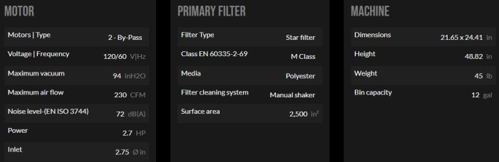 An M class polyester filter ensures effective filtration in the vacuum. The unique star shape of the filter allows air to pass through, even when it becomes dirty. The filter fabric is classified as M Class according to BIA and EN 60335-2-69 standards. This classification signifies that the filter effectively traps particles up to 1 micron in size, providing protection for the motors and the operator using the vacuum cleaner.