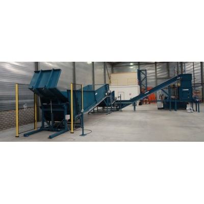 The bale feeding system is an option for the semi-automatic or automatic wiper presses. It consists of a tilting device for bales, a storage conveyor and a feeding conveyor that feeds the weighing belt towards the press. This option makes the work for the weighing operator easier and faster, since the material arrives more or less automatically on the weighing belt. The operator only needs to regulate the flow and add or remove a few pieces to achieve a correct weight.