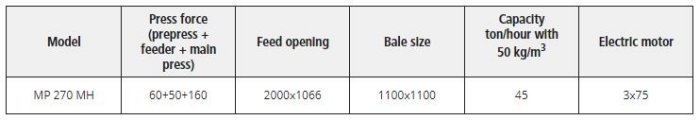 The Mp 270 MH has a real capacity of 45 tonnes of material* per hour. That’s 50 percent more than Presona’s second-largest baler, the LP 140, and three times as much as the smaller LP 60. (*Material weighing 50 kg/m3 before baling.)