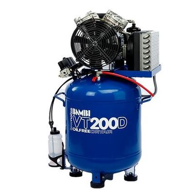 Built with quality in mind, Bambi VT200D air compressors deliver oil free, clean & dry air. Capable of running a 4 chair dental practice* the VT200D features Bambi’s desiccant air dryer unit designed to guarantee “desert dry” air. The multi row, fan assisted after-cooler reduces the air temperature prior to entering the dryer. Dramatically reducing the air temperature enables the integral coalescing filter to collect and remove water droplets as small as 0.01 microns. This process allows removal of 99% moisture content before the desiccant adsorption achieving a dewpoint as low as -40°c**