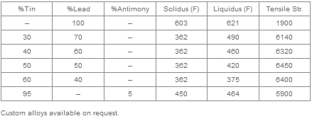 Bar solders are composed of pure metal or metal alloys that are melted down to fuse interconnecting pipes, joints or metal components. Bar solders are resistant to both oxidation and corrosion. As a leading solder supplier, Canada Metal offers a diverse variety of high purity lead- and tin-based solder products, including pure tin bar, 50/50 and other alloy compositions. We also produce specific alloys such as copper-lead, antimonial lead and other application-specific alloys on client request. Browse our selection of standard alloys below and contact us today with your requirements.