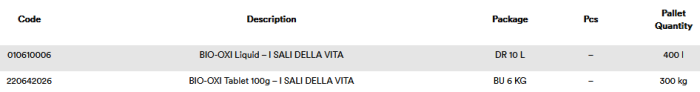 Bio-oxide agent that develops active oxygen and in synergic combination with "i sali della vita acqua madre" keeps your swimming pool clean and hygenically perfect. It is particularly suited to waters with a high saline content.
