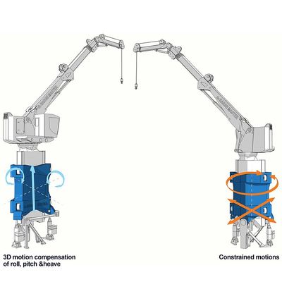 The BM-T40 Motion Compensated Crane by Barge Master is engineered for enhanced offshore operations, providing controlled lifting capabilities in challenging sea conditions. This crane significantly extends workability, particularly in areas like the North Sea, from 180 to 330 days by compensating for vessel motion at its base, ensuring stability of the operator cabin and the load. With a compact design, it can lift up to 32 meters above sea level, handling loads of 5 to 15 metric tonnes at varying reaches. Certified for manriding, the crane is suitable for transferring personnel safely and managing typical loads such as hoses, tools, and turbine parts. Its cutting-edge motion compensation technology involves hydraulic cylinders that counteract heave, roll, and pitch motions, controlled via motion reference units for precision. The system's versatility allows integration into new builds or retrofitting, making it an adaptable solution for maintenance and platform supply vessels.