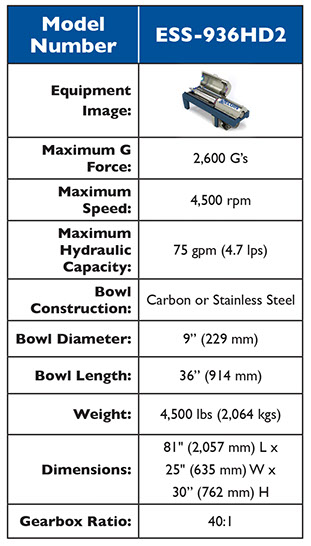 The ESS-936HD2 decanter centrifuge is designed for low volume separation performance. The slim-line design is ideal for placement in small spaces to meet operational needs. Featuring a 15 hp main drive motor and 5 hp back drive motor, four (4) stainless-steel epicentric liquid-end discharge ports, three (3) wide-mouth solids-end discharge ports, and premium gearbox with 40:1 ratio. The bowl is constructed with 304 stainless-steel or carbon steel with tungsten lined internal conveyor.