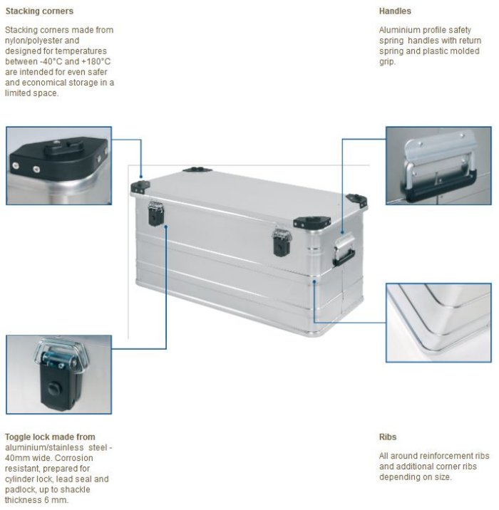 Aluminum boxes intended for industrial & universal use for a broad range of applications, like: manufacturing, packaging, storage & transportation, organization or protection. Robust transportation boxes, superior in safety and economical in use, equipped with all necessary features to fulfill various tasks.