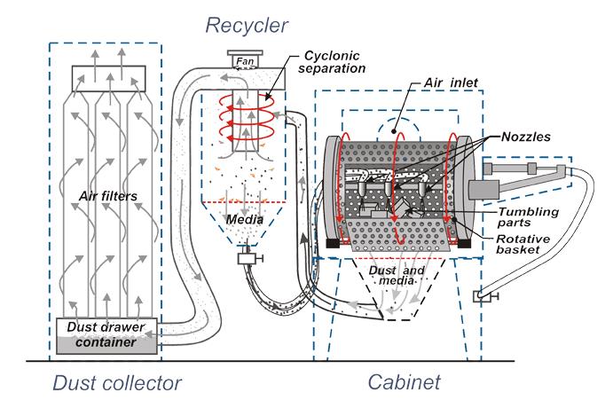 - Media Reclaiming System: Cyclonic separation of contaminated abrasive media for optimal performance – dust and by-products are diverted to the dust collector.