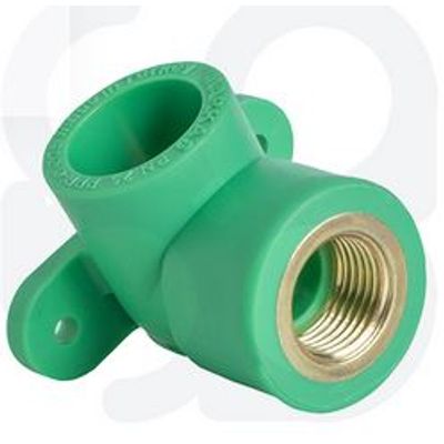This piece is used in connections under plaster. Behind the interior threaded elbow, there is a fastening piece with holes. When the battery is correctly adjusted to its place, the elbow is screwed to the floor. The elbow is made of chrome plated brass and laminated with plastic.