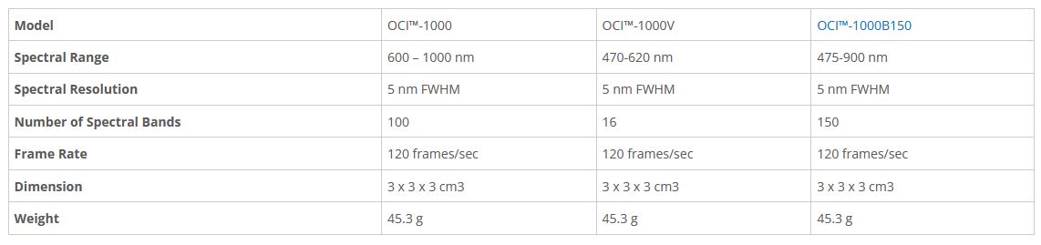 OCI-1000 series VIS-NIR hyperspectral imaging cameras are extremely compact, light, and rugged. They cover visible – near-infrared (VIS - NIR) spectral range from 470 – 1000 nm.
