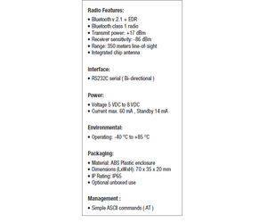Users to access Bluetooth® functionality with simple ASCII commands delivered to the module over serial interface - it's just like a Bluetooth® modem.