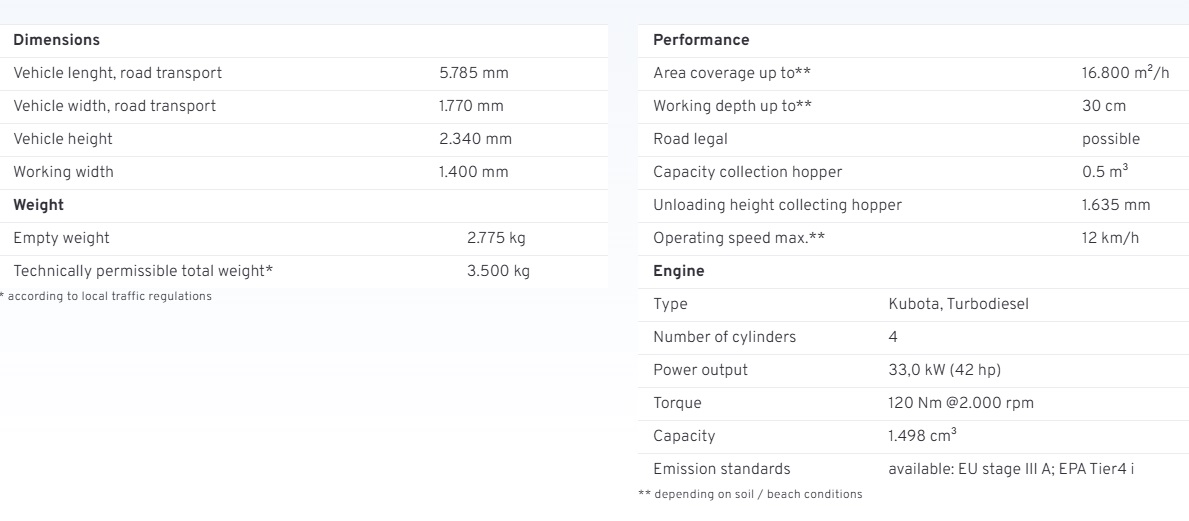Small turning circle: Thanks to articulated steering and switchable rear-wheel steering, BeachTech Marina gets around any obstacle with ease. Flexible application possibilities: The extensive range of accessories for BeachTech Marina turns the beach cleaner into an economical multifunctional tool. Road approval: The beach cleaner meets all the criteria for road approval and can therefore easily be used for several beaches ("beach hopping").