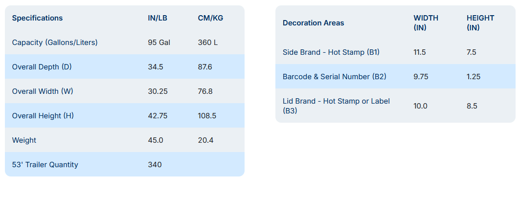 - “Ready-To-Roll” Design - Lids, Locks, Catch Bars, and Body are fully assembled upon delivery; Assembly time for wheels and axles averages less than 10 seconds per container