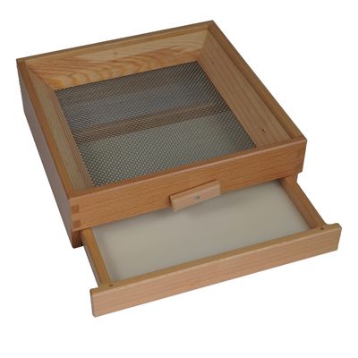 Sieve to determine beetle infestation for a sample quantity of approx. 200g. Beetle sieve made of wood with pull-out drawer for determination of beetle infestation. Sieve the average sample about 1 minute, then check the contents of the drawer for insects.