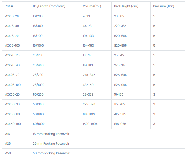The empty MXK low-press liquid chromatography columns are designed for standard liquid chromatography of macromolecules. The main parts of the columns are the glass tube, thermostatic jacket, column end pieces, column bottom piece, adapter and tubing. The glass tube is made of borosilicate glass, which has a length of 200, 400, 700, or 1000 mm with an inner diameter of 16, 26, and 50 mm.