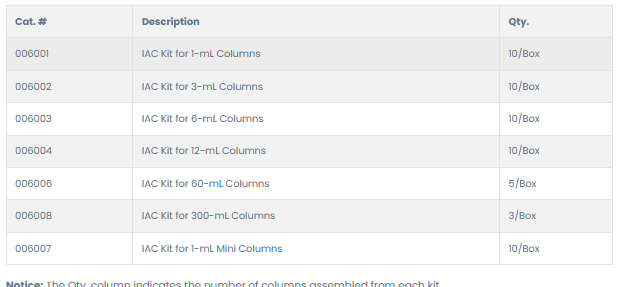 BeingBio provides immunoaffinity chromatography (IAC) kits for packing your own IAC columns. Each kit includes empty columns, frits, top caps, bottom caps, assembly rods, suction syringes, connection pipes and one instruction manual for you to easily pack IAC columns with chromatographic media.