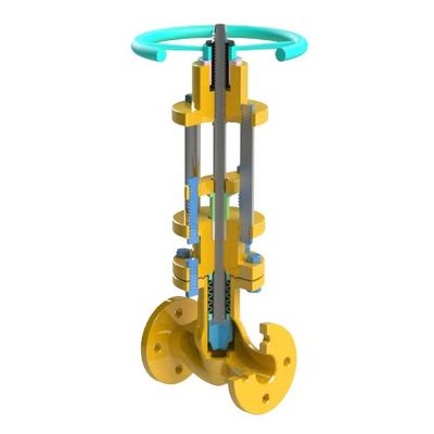 Euro-Chlor Bellow Seal Globe Valve- featuring ASME B 16.5 flanges, ASME B 16.10 face-to-face flanges, ACME screw thread stem, and grounded shaft. Multiple wall liquid-protected bellow built of Hastelloy C 276 with a minimum life cycle of 10,000 cycles, metal back seat, PTFE safety stuffing box packing, stainless steel spiral wound bonnet gasket with PTFE filler material and housed in a tongue and grooved flange. The valve was tested in accordance with EURO CHLOR GEST 89/140.