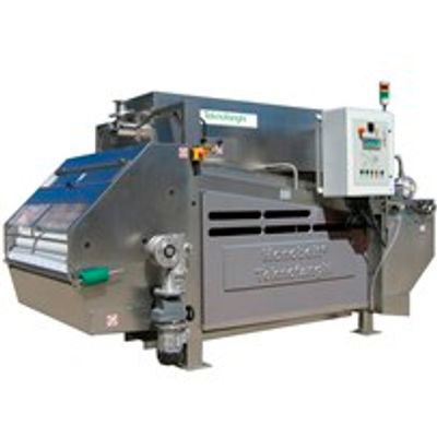 The belt filter press is composed of two units, the pre-thickener and the sludge press. The pre-thickener performs the initial solid/liquid separation stage, taking sludge solids concentration from 0.5-3% up to 5-15%. AThe dewatering in the press occurs firstly in the low pressure zone, then in the wedge zone and finally in the high pressure zone where the filter cake is compressed between the perforated cylinder cloth and the main cloth. The discharged sludge cake can reach dry solid contents variable from of 18 to 30% depending on the sewage sludge. The belt press can be used for mixed fiber, biological, chemical sludge.