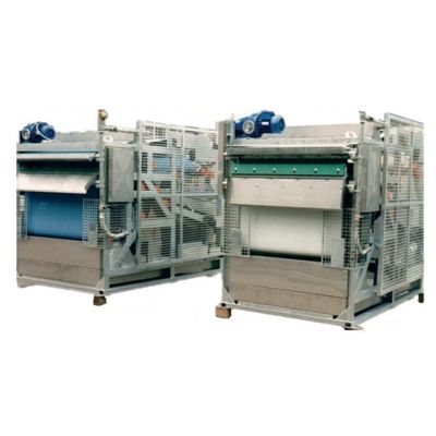 All 16 rollers are in AISI 304 stainless steel. The electrical motor drives a manual controlled speed variator (10-50 rpm). Two bars with spray nozzles (one for each belt) wash the belts after the cake has been discharged. The frame is a very strong structure of welded carbon steel beams, hot dip zinc coated (or in A304 stainless steel, on request). Two scrapers, one for each belt, scratch out the cake. All filtrate water (dehydration, belts washing) is conveyed through different tanks in a large lower tank which allows the belt to need no special basement. All tanks are in AISI 304 stainless steel.