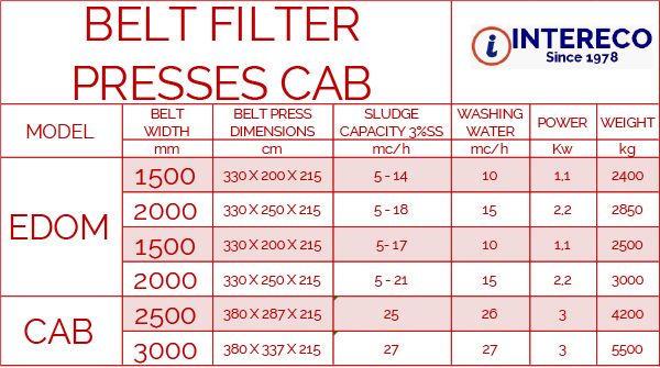 After a twenty years long experience of units installed all over the World, INTERECO produce belt press to 3000 mm belts width. Apt for any type of sludge: Biological, chemical, paper milk dairy, inert and tanneries. To save money for the shipment, it is no necessary to use wood cages. For a belt press CAB 2000 is enough a 20” Flat Rack. Belt press EDOM and CAB 2500-3000 are divided in two parts, to be assembly in site. Also for these reasons, INTERECO is more cheaper than our Competitors.